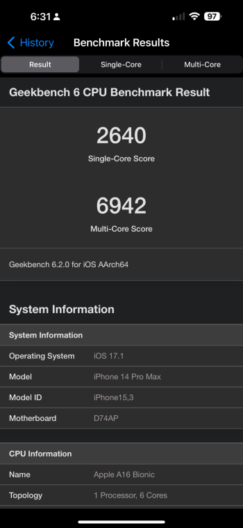 well wait and see if throttling happens, anyway just did Geekbench right now with my one year old iPhone 14 Pro max iOS 17.1 beta with increased results both single core and multicore, didn't see this coming. Thanks Apple.I wonder if the update will throttle the phone, making it slower. It will be interesting to see the speed tests.