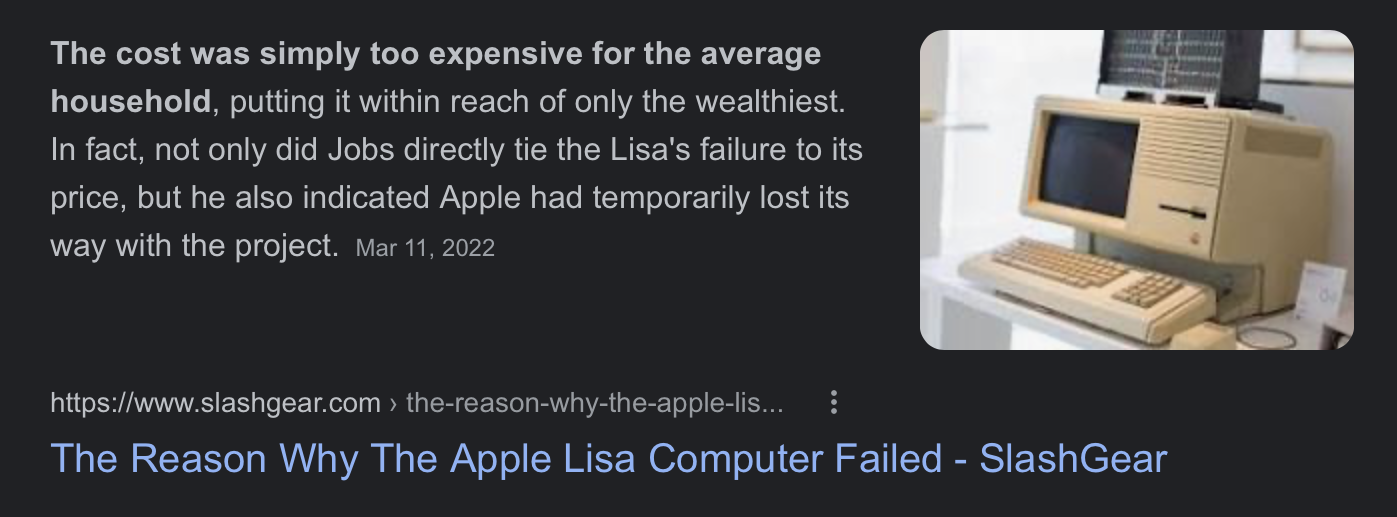 The Lisa was intended to be a business machine while the "lower cost" Macintosh would be the household computer.As much as I think an Apple Car would be cool, it’s definitely not practical. I don’t see this happening. It actually reminds me of another Apple product….