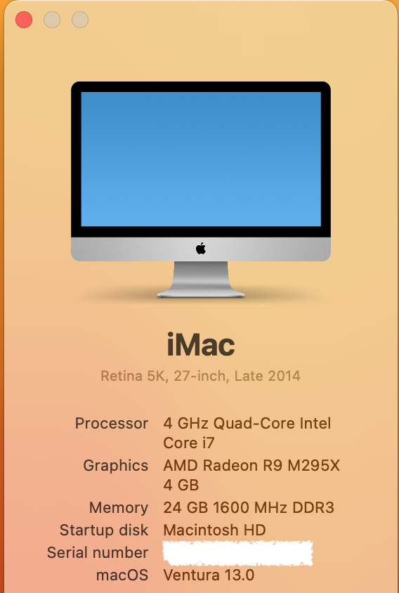 Awesome! You're welcome! Let me know if you experience any issues with sleep/wake or continuity camera not working.Thank you so much. I now have Ventura on my iMac late 2014 5K iMac. Open Core Legacy Patcher is amazing. Just as fast as Big Sur and everything appears to be working well.