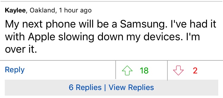 “I’m tired of Apple slowing down my phones so I’m going to buy a Samsung which will not lag like crazy within a few months! Take that Apple!”