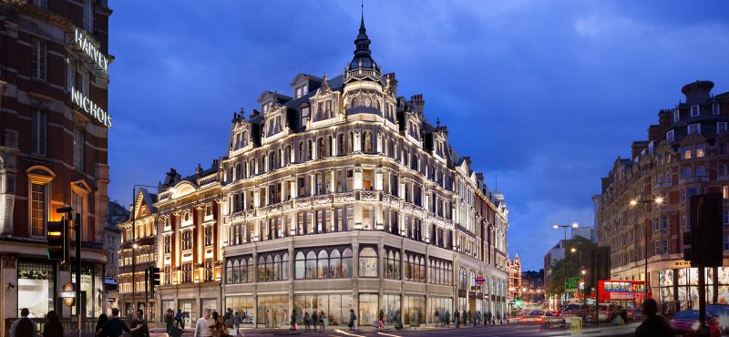 The landmark development is currently surrounded by a public artwork installation called "The Knights of Knightsbridge" to conceal construction.