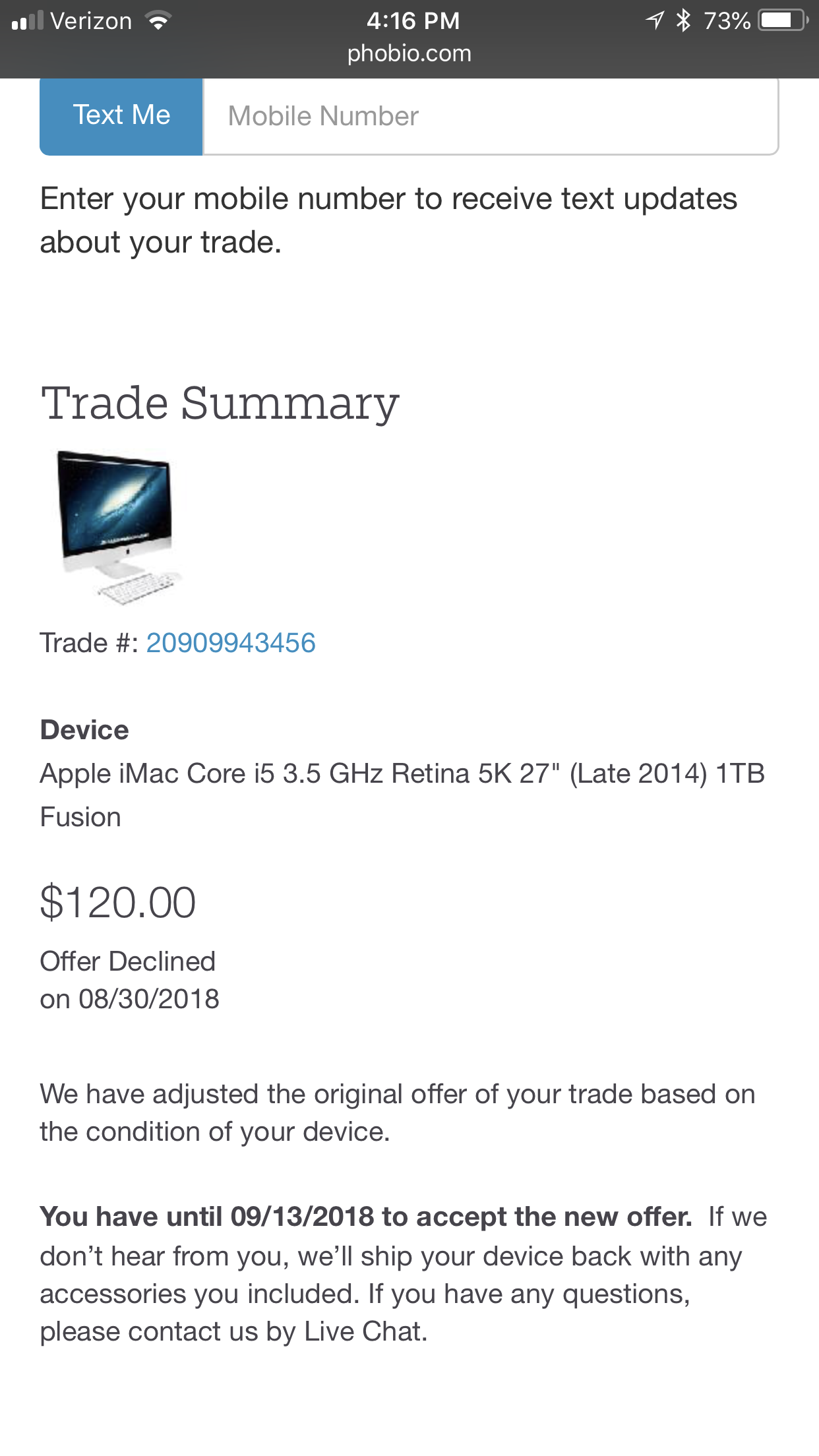 So I call my local Apple Store and they say they’ll take it as a trade-in in store! So I love the thing down there in its original box in mint condition and they don’t even look at it and tell me someone missed communicated with me and to send it out via their trade-in program! So I do and a minor speaker grill dent cost me $420! So naturally I rejected the offer!
