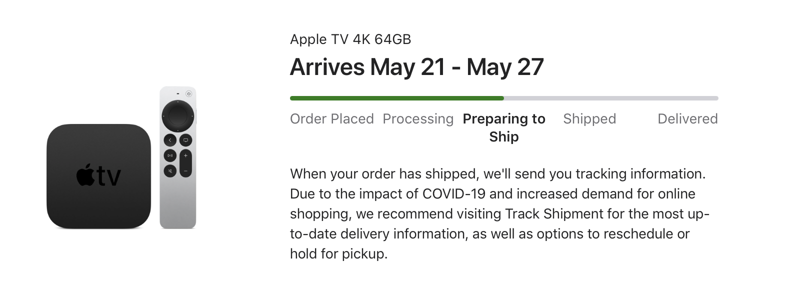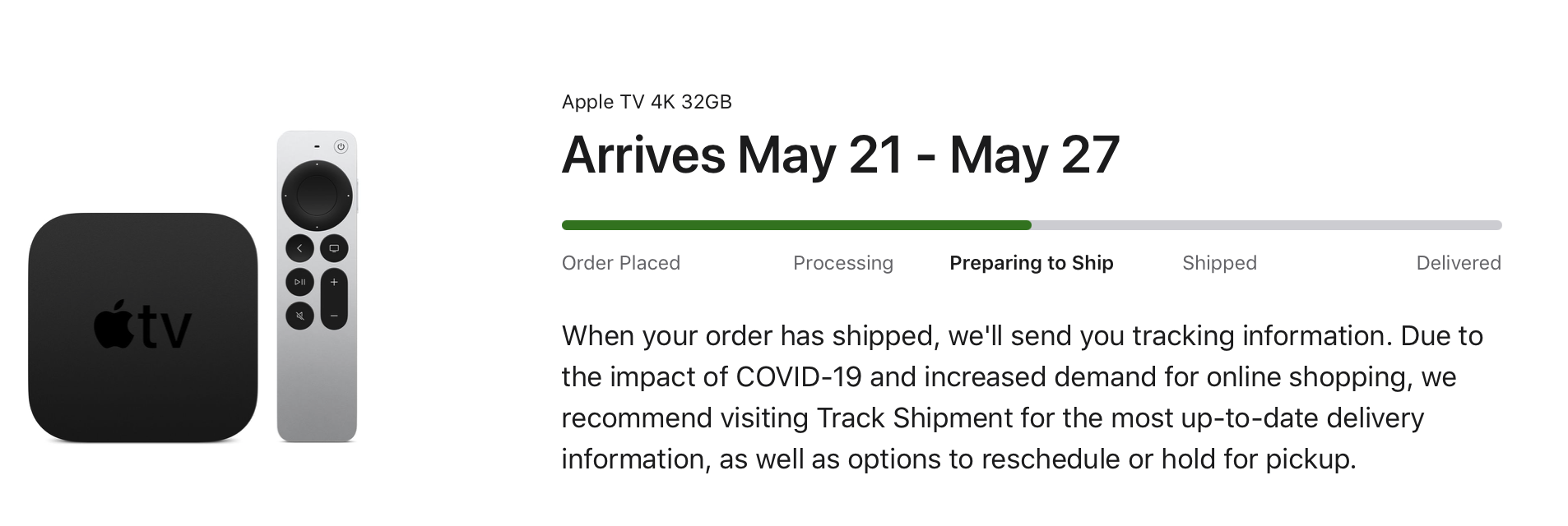 Article Link: Apple TV 4K Orders Now Preparing to Ship Ahead of May 21 to 27 Delivery Estimates