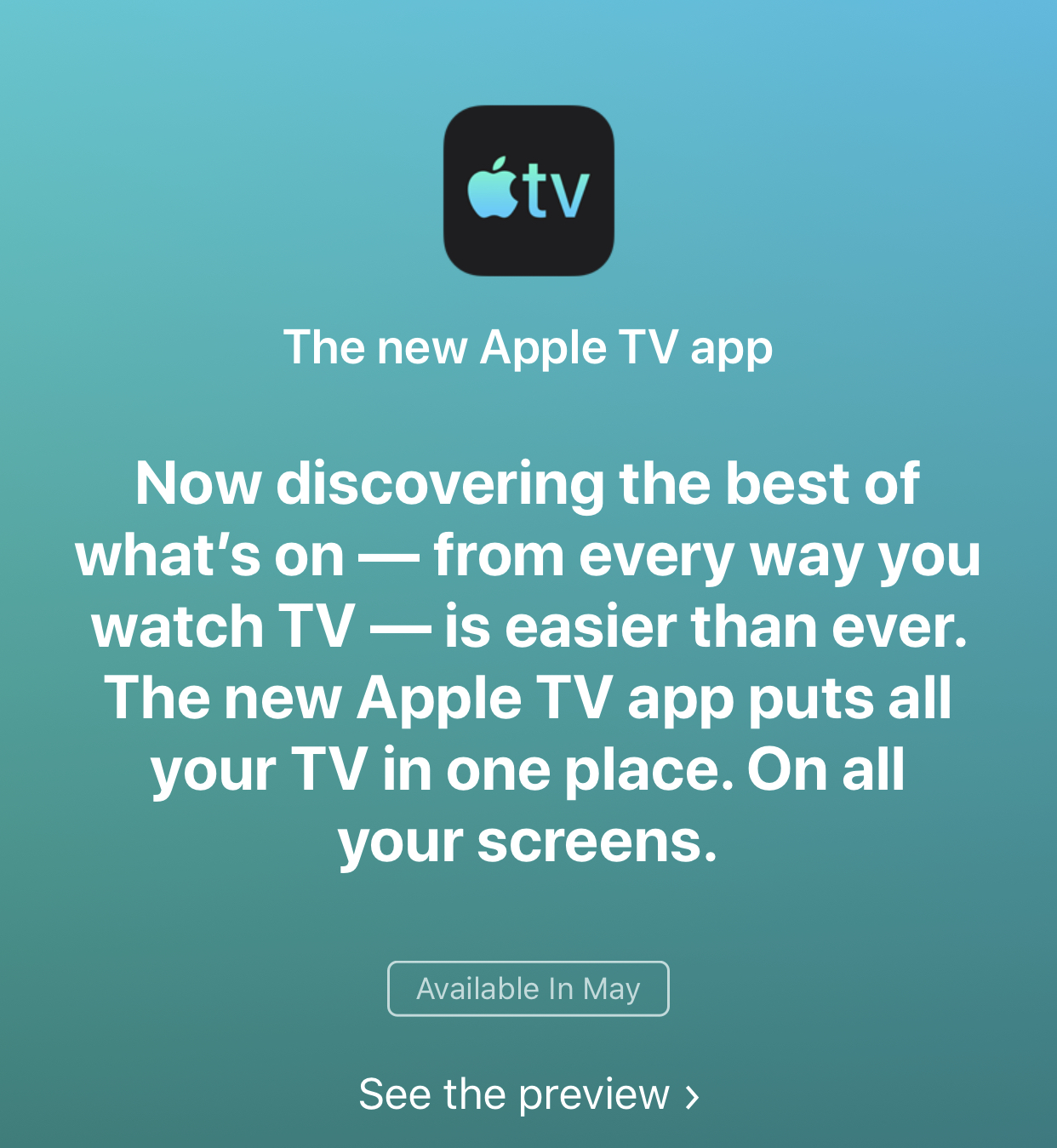 Apple TV is now the app, not the box. The box is called Apple TV 4k and Apple TV HD — but not for long, I imagine. I think we’ll see a new Apple TV box launched before the Fall when Apple TV+ goes live, likely with a new form factor and a new name.