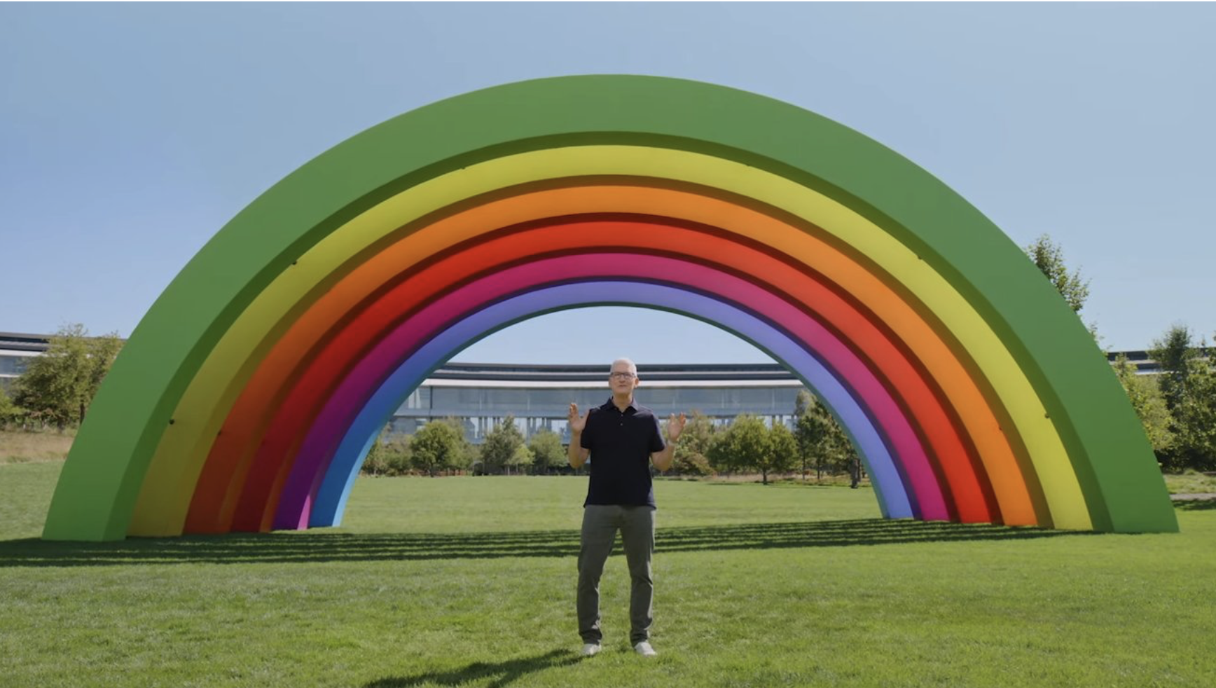 irrespective of your interpretation of the correct colours and their sequence, sir tim is standing in front of a figurative rainbow.No. Blue isn’t next to red (need to be next to green). Where is indigo and violet? And the order is typically reverse (red on the top of the bow going to violet in the inside).