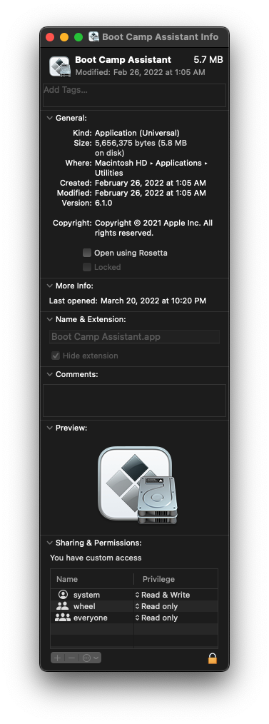 You sure you didn't get that copied over by restoring a Time Machine backup or similar? My M1 mini doesn't have it.I hate that Apple mocks me by still including the BootCamp app on my M1 machine, and even crafting a nice compatibility error at launch. Thanks!