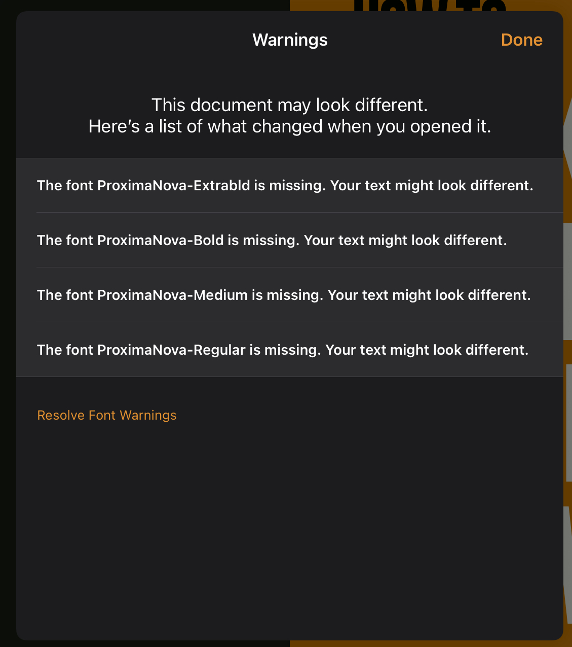 I think it was twofold. EitherI had this problem too. My resume was created in Pages on my Mac and uses Proxima Nova as the principle typeface for the document. Everything is fine on my Mac, but when I open the doc on my iPad I'm presented with the missing fonts warning and I haven't been able to figure out how to fix it other than resolving the error by changing missing fonts to Helvetica (which I may have to do). Was there a fix above? If so I missed it.