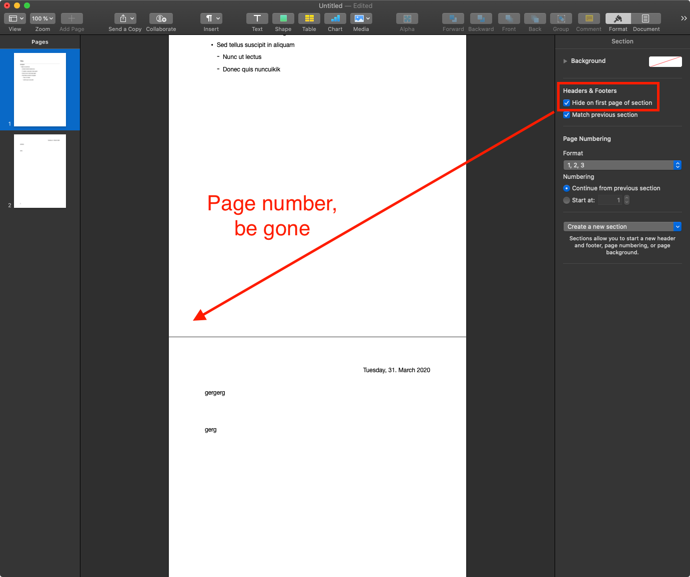 It’s still there for me.UH-OH -- what happened to the "Section" tab under the "Document" tab? I used this on all my documents to remove the page number from the first page of a document -- why did Apple remove this? It made things so much easier