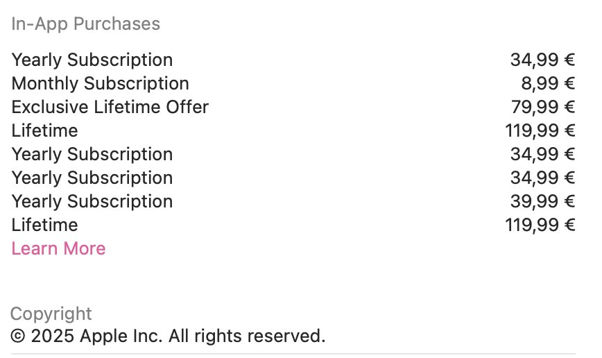 Maybe the yearly plan is just colliding with Lifetime and it can be chosen after the trial has ended. I have to wait 6 days now to find out. But it's strange that the App Store is showing four different "Yearly Subsctiptions here". And three Lifetime subscriptions here: