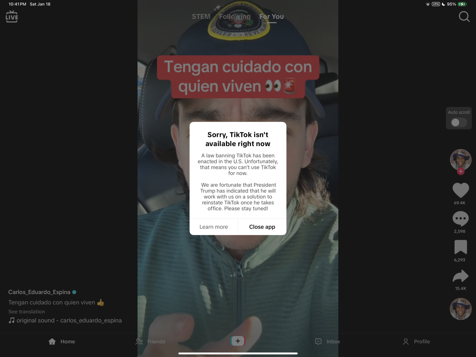 This development comes after Apple removed TikTok from the App Store in the U.S. earlier tonight. In the U.S., a law banning TikTok unless Chinese company ByteDance divests ownership of the platform takes effect Sunday, January 19. The app is "temporarily unavailable" in the U.S., according to an in-app notice being shown to users tonight.Apple may use the IP address of your internet connection to approximate your location in order to determine whether certain beta apps that are subject to legal restrictions in some regions can be made available to you.