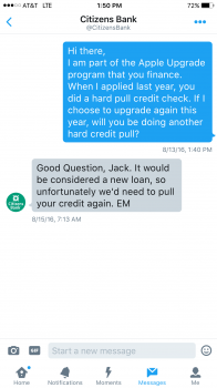 Why not call Citizens one? tel:1-888-201-6306 They should be able to tell you definitively.My main concern and yet to be answered question is, do they perform a credit check on your every time you upgrade? This is huge for me because we are looking to move in the next year and don't want multiple credit checks hurting us.