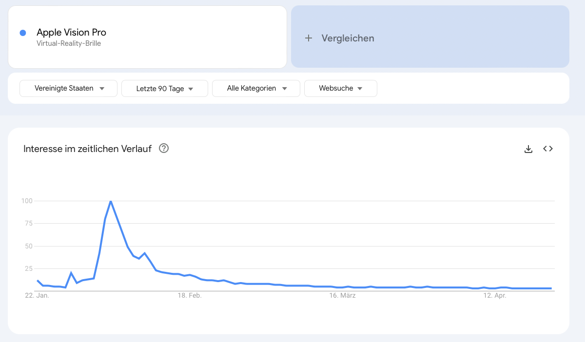 Apple Vision Pro, Apple's $3,500 spatial computing device, appears to be following a pattern familiar to the AR/VR headset industry – initial enthusiasm giving way to a significant dip in sustained interest and usage.
