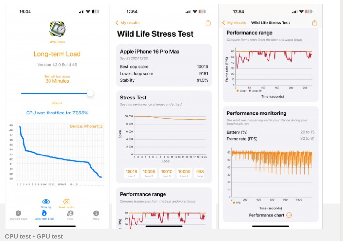 According to GSMArena tests (they clearly are in favor of Android, overall, but they admittedly have a nice set of testing ), under load Apple A18 Pro has an impressive 78% of CPU stability (throttling over time) and and even more impressive 90% of GPU stability.