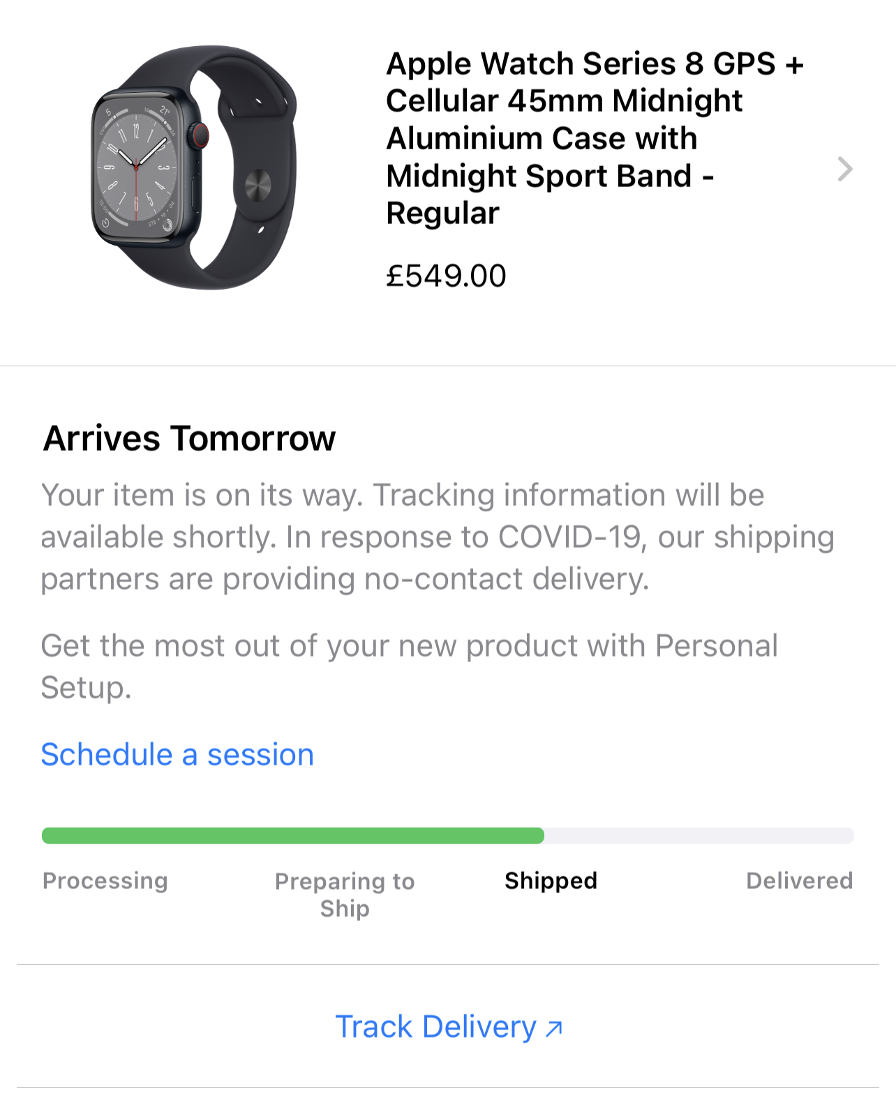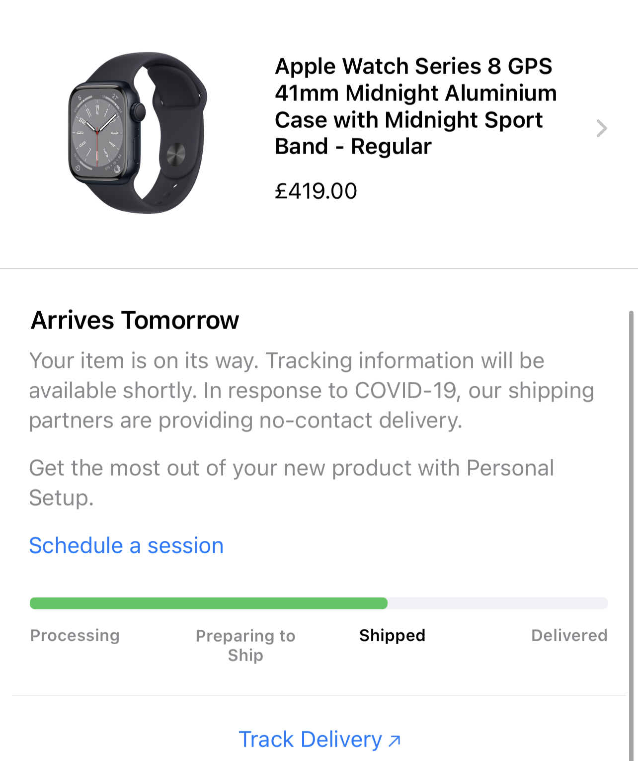 Yup that's the Watch! I noticed mine appeared in the UPS app as well for Next Day delivery and waiting for pickup 🥳Has anyone had theirs shipped from Carlisle, PA? I'm seeing a 1.3 LBS package coming from Apple that's showing up in MyChoice for delivery tomorrow and I'm wondering if it's my watch since it's been Preparing for Shipping and I still don't have a tracking number for it.