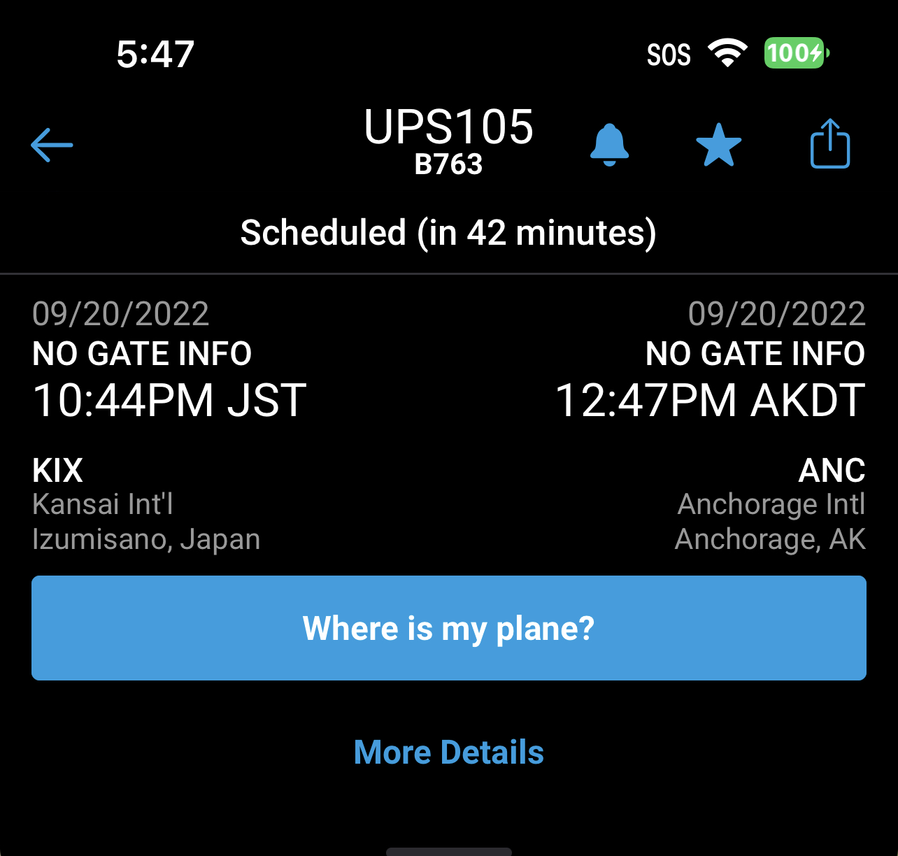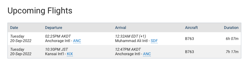 It stops in Anchorage, Alaska to go through customs clearance and re-fuel the aircraft.The Osaka flight UPS105 is actually the same plane going to Anchorage, then all the way to Louisville! Whoa!