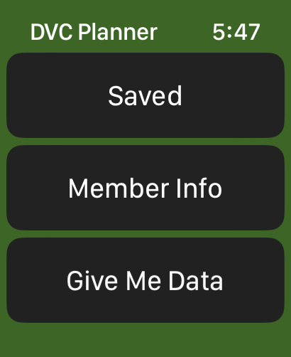 What's a DVC?Here's some pics of my DVC Planner app for the Apple Watch. It's a companion app in that it needs the iPhone's DVC Planner app to help out. I think the UI is functional if not beautiful.