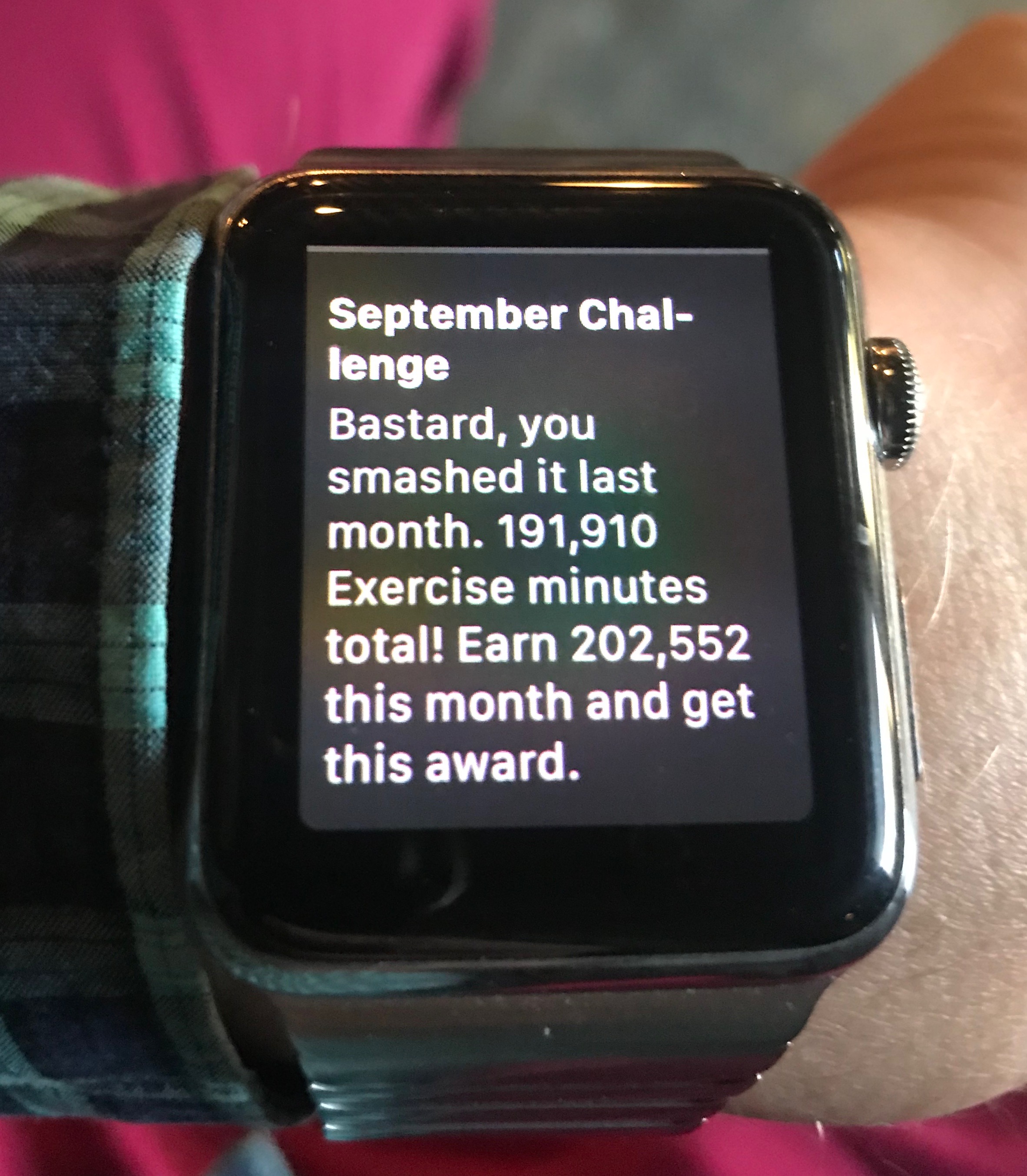 I did my July challenge. Then the August challenge was completely unreasonable (average an extra 260 calories per day on top of my already too high average). And then the September challenge which defies temporality.That's a LOT of minutes!