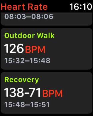 If you have multiple workouts performed on a single day, the "Recovery" heart rate appears after each workout in the Heartrate app on the watch: