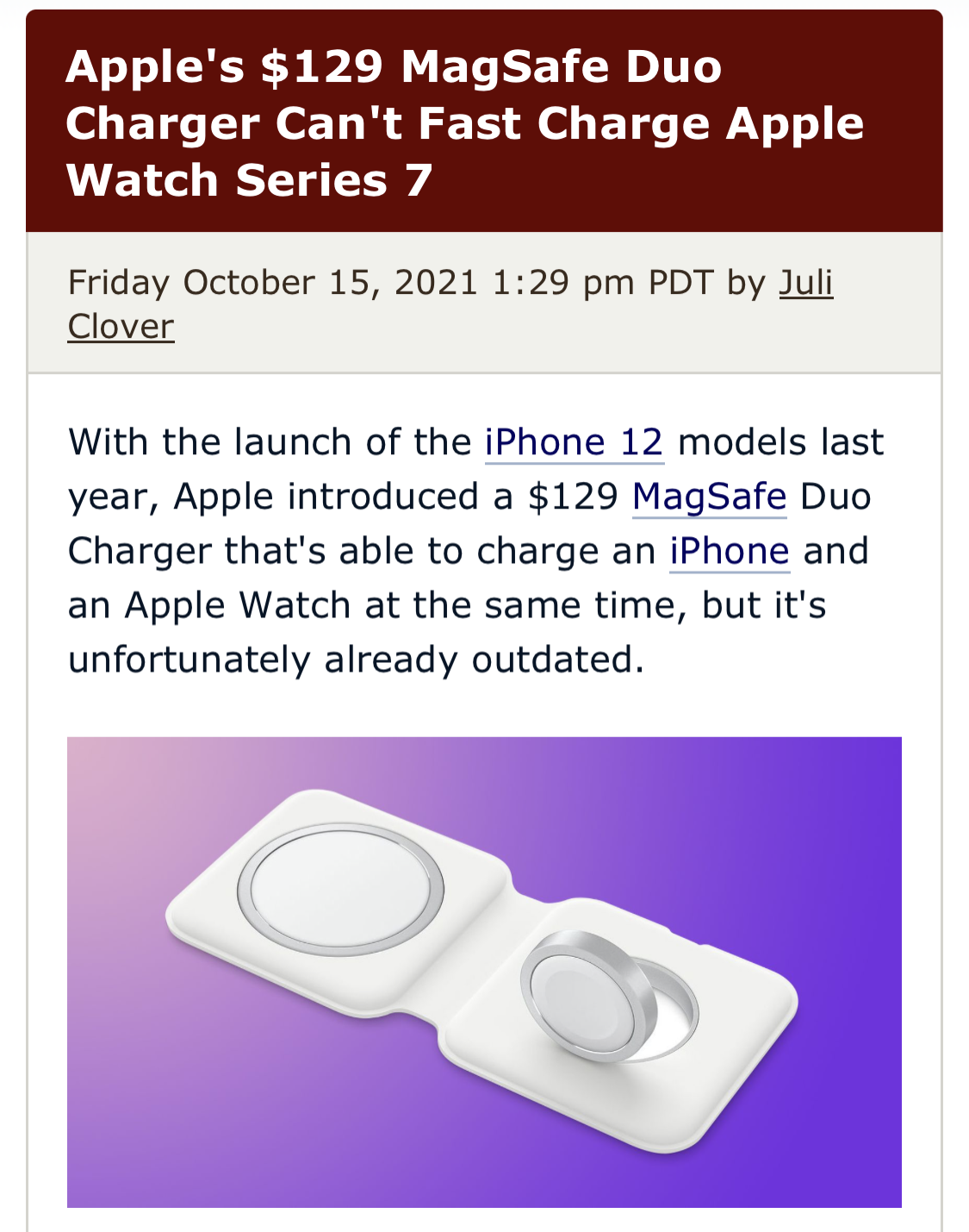 Apple Watch fast charging was introduced with the Apple Watch Series 7 in 2021, enabling devices to charge rapidly from 0 percent to 80 percent in about 45 minutes. Apple apparently had shortages of the newer charging module at first, forcing some MFi accessory makers to use the older, slower technology. Going forward, Apple is focusing on production of fast-charging modules only.