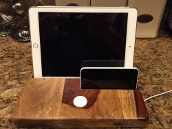 I started with an old cutting board we had sitting around due to the grains in the wood. I figured it would clean up nicely. I routed out the slots for the ipad and iphone then countersunk the Apple Watch charger to be just shy of flush with the wood. Watch sits nicely as if its simply laying on the board. Turned out good for the first design. I may look around for some different wood for mine. May also include a small slot for my ring and loose change.