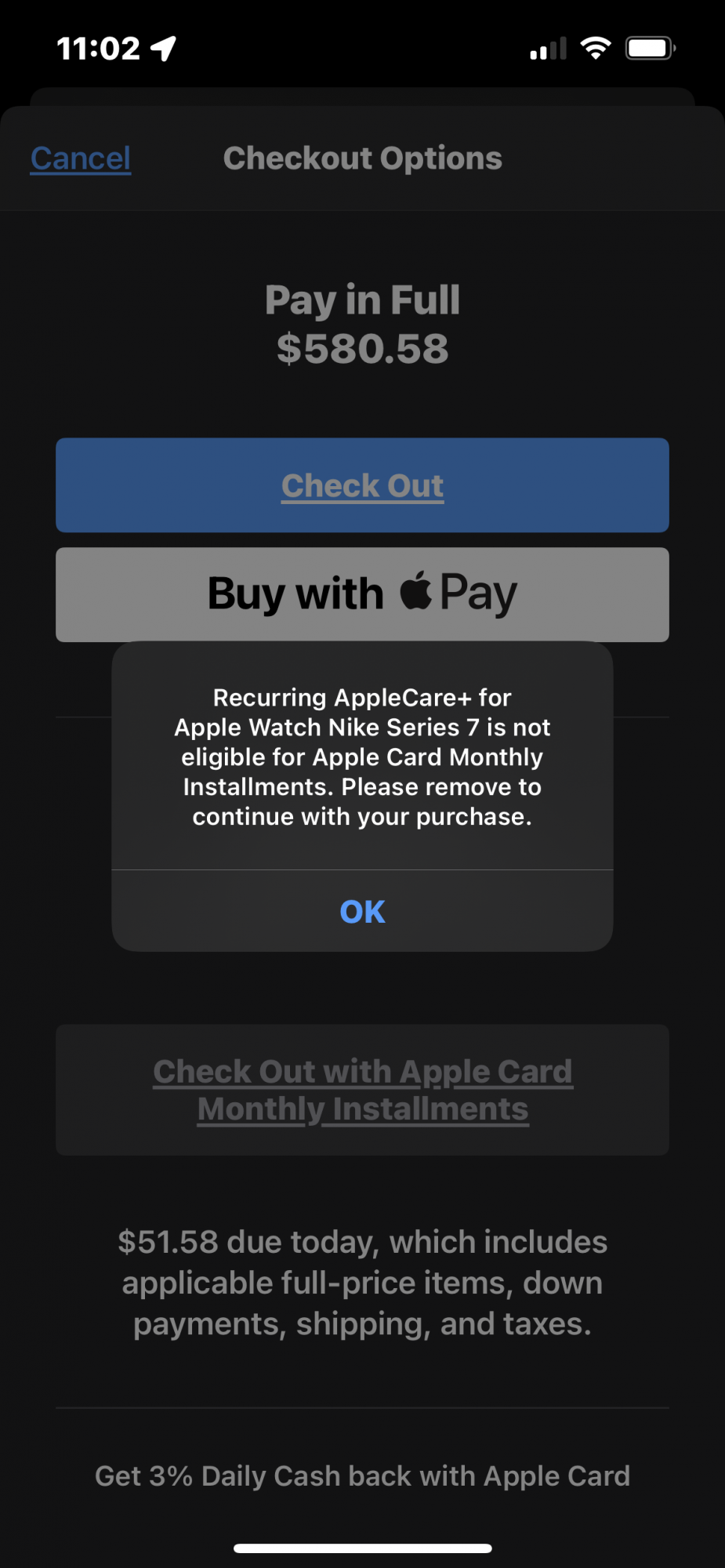 Any idea why I cannot do monthly payments on my Apple Card for the Nike S7?