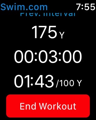 - shows last interval you swam and pace (ex. 100yards @ 1:20/100yds)