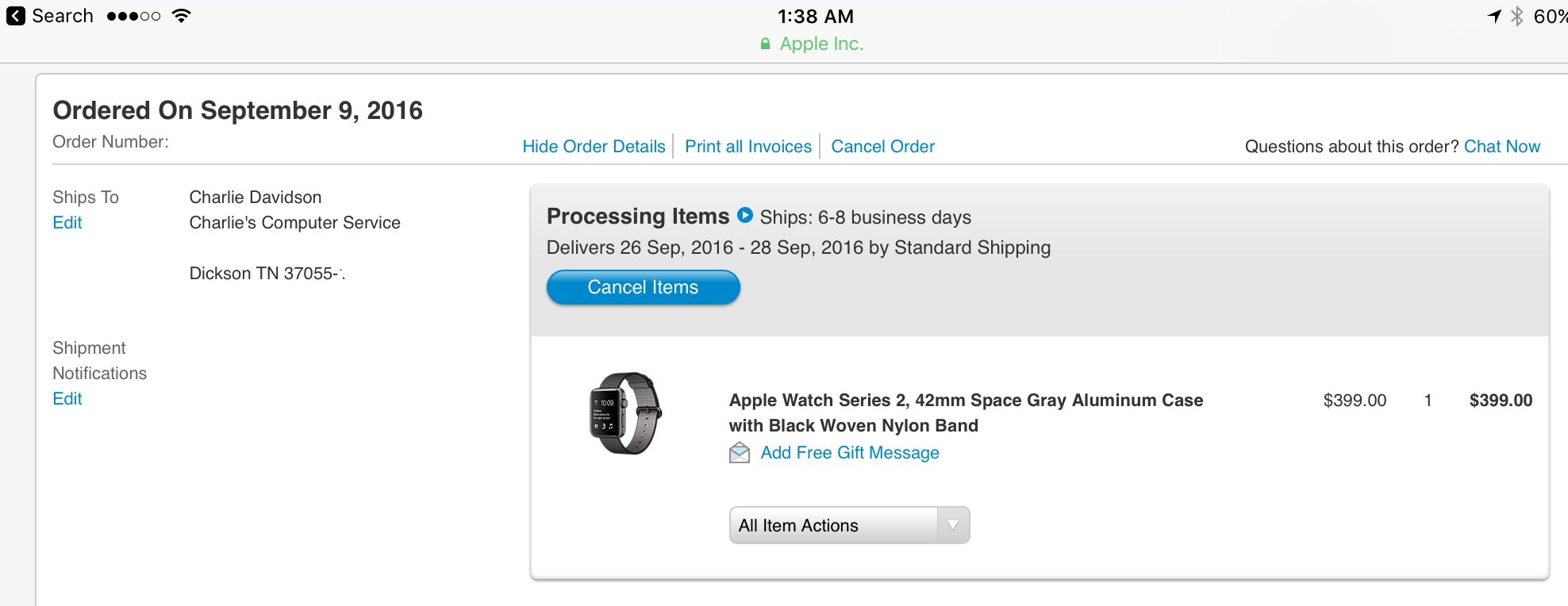 Mine still says 'Preparing for Shipment' with a delivery date of 9/16 on Apple's site. When I check UPS it says it departed Anchorage Alaska, and that is where the status has been sitting since Tuesday night.....Hoping today I get a 'Shipped' status change from Apple.com and see some progress as delivery date is tomorrow. Really hoping it hasn't been pushed back, as Best Buy customers are seeing their Watch Series 2 dates pushed back.....