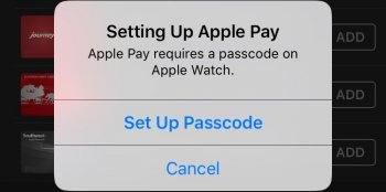 This is the pop-up I get when I try to add a card from my Wallet to my Apple Watch.