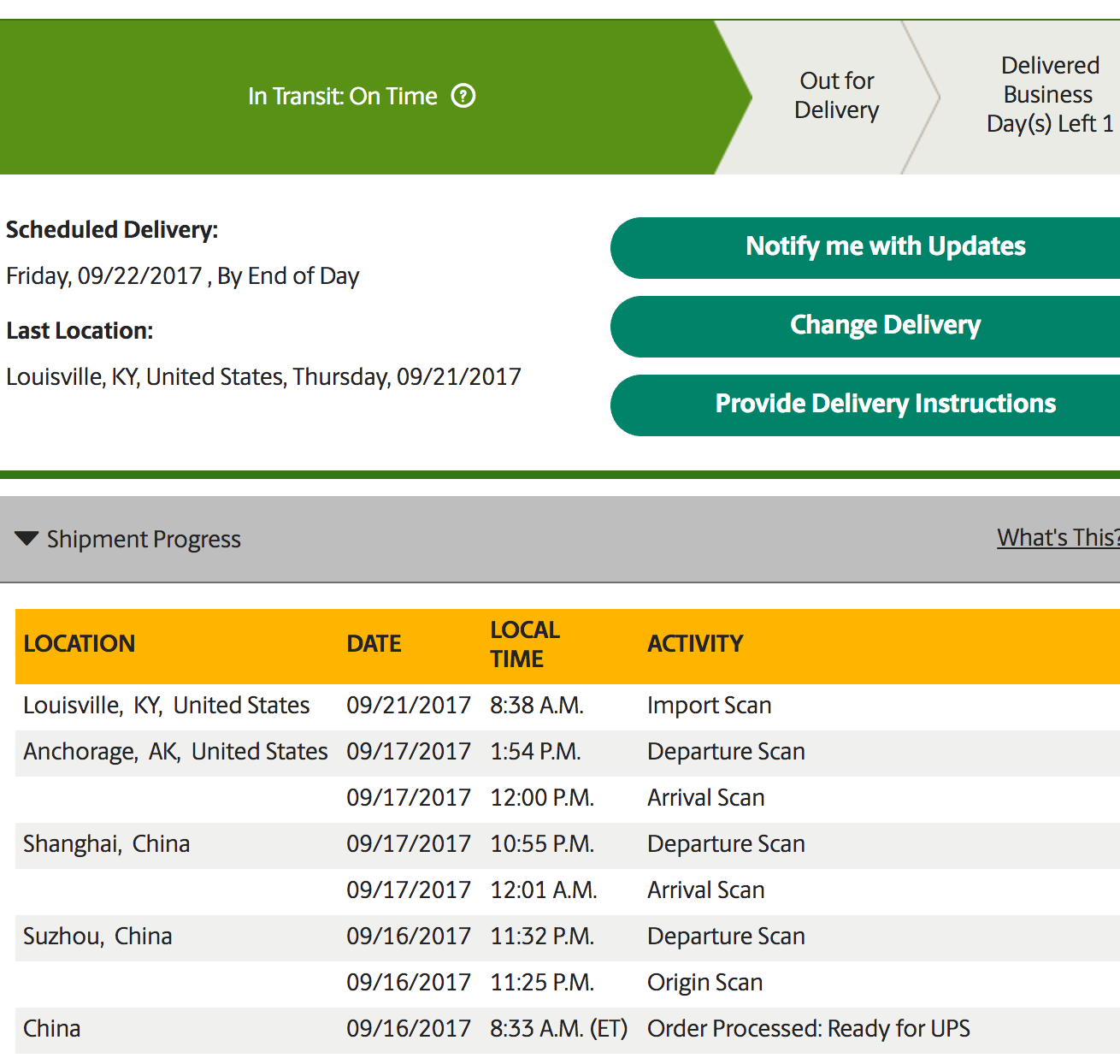 There must be delay as my tracking has showed this whole time and is identical, must have been on the same planes!I woke up this morning to that Apple notification telling me my Watch has shipped. I ordered at 3:02 am on the 15th and was given Sept 22nd delivery, there has been no change in my order since it went to preparing for shipment last week or so. My tracking shows what someone else had mentioned here, things have been moving but there was a delay in any tracking info. Yesterday nothing, today my Watch is in Kentucky!