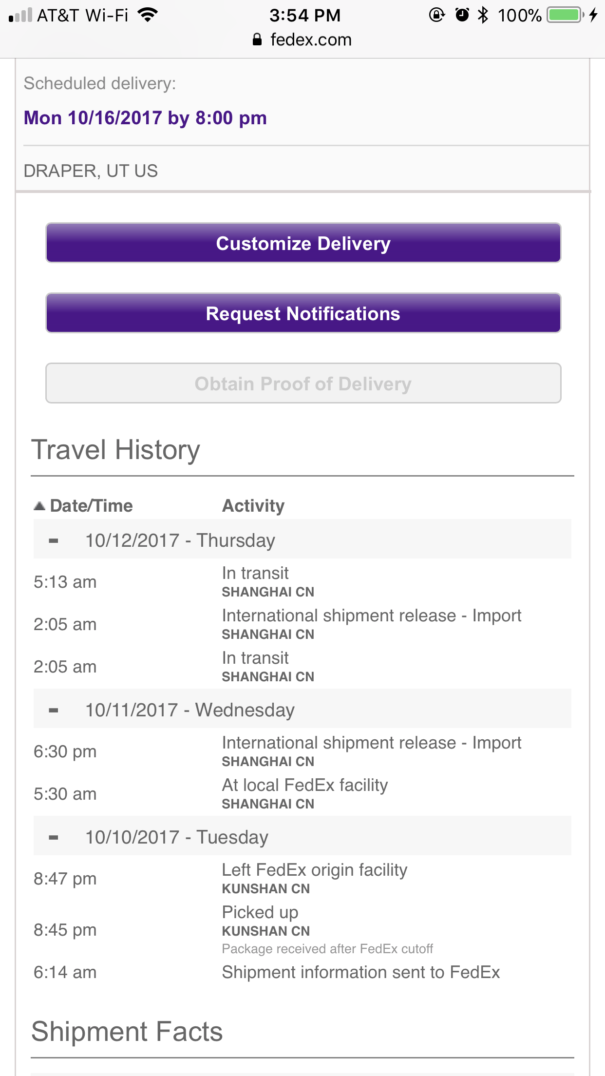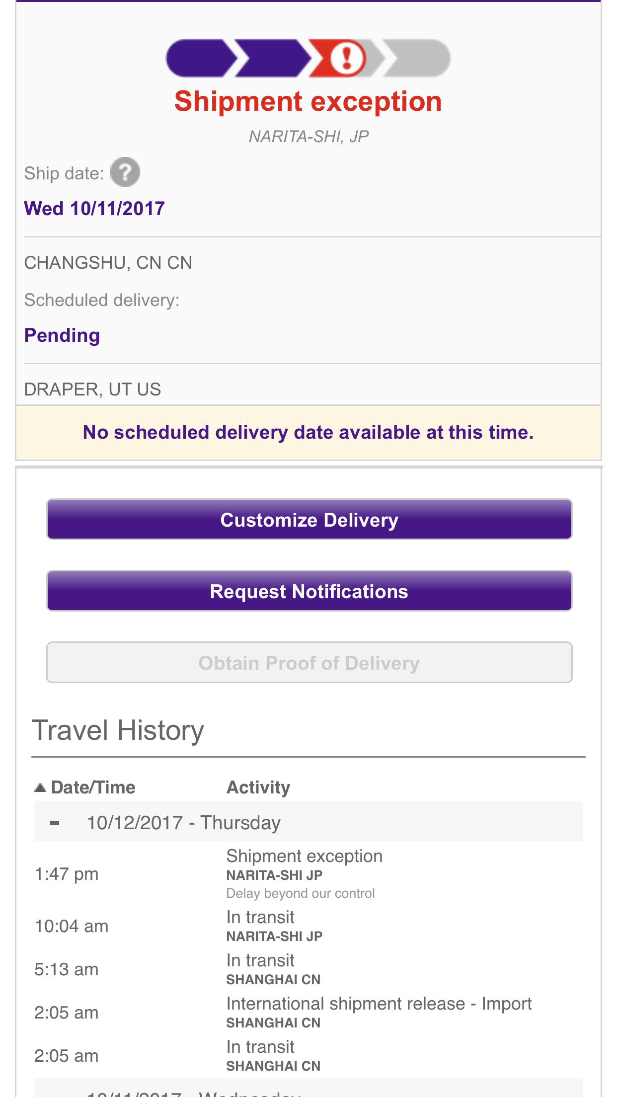 But, on the UPS site, the shipping details don't show any activity since 10/10. It looks like it was put into the system at 10:06 a.m. ET on 10/9 in China. It then left Suzhou, China and arrived in Shanghai the morning of 10/9. There are lines in the history that talk about awaiting clearing agency review, but the last thing is an export scan on 10/10 at 9:52 a.m.