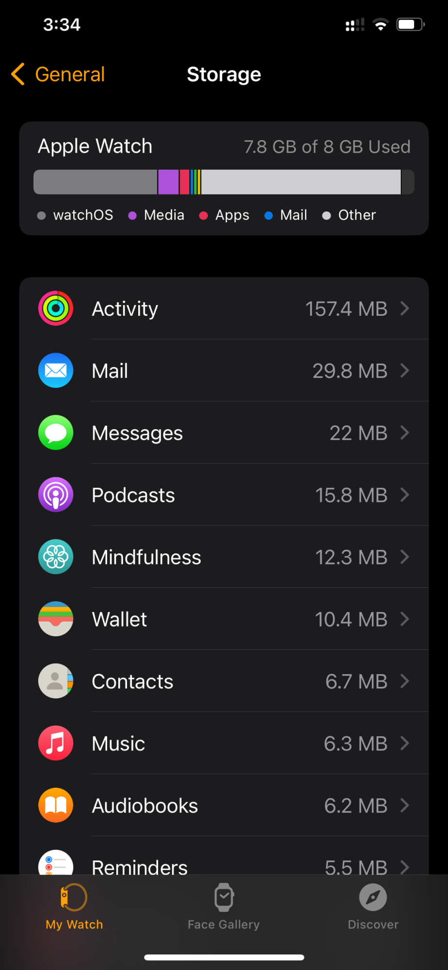 Recently my Apple Watch 3 has been warning me that it is running out of memory and I can’t figure out what is using the storage memory. I removed photos (I think two) that were stored on it as well as a few apps. I’m pretty much down to just the core apps Apple includes and the OS but the memory usage hasn’t really changed. Any thoughts? Here is a screenshot of the memory usage.