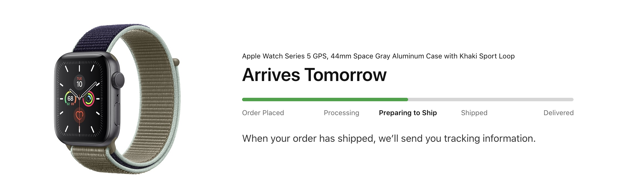 so my apple watch was charged and preparing to ship meanwhile the apple watch band i ordered separately has been preparing to ship this whole week