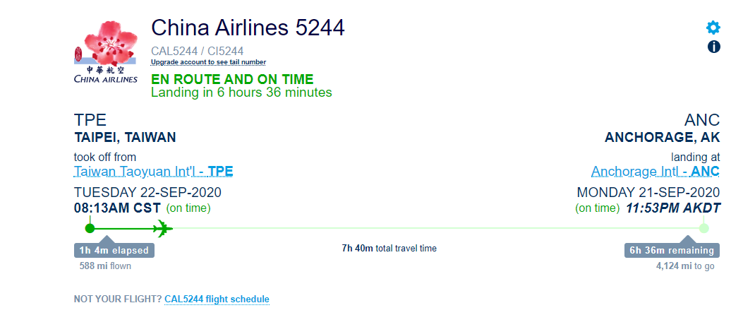 Yeah, I don't think my AW S6 is on this flight. I don't see any Departure Scans matching the time this flight left Taiwan...Hi everyone, I believe I found our plane again, it has just left Taipei for anchorage, so we should see scans show up soon, if our watches are on it. It is CAL5244