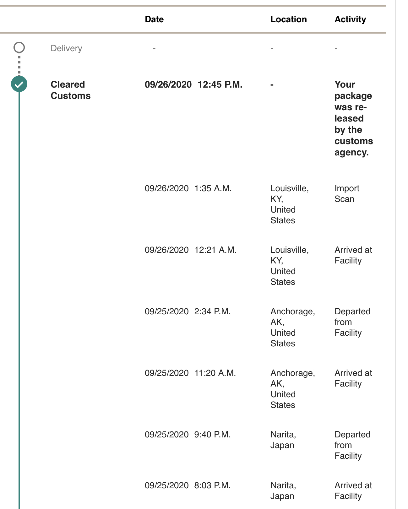 No movement. I’m under 500mi from Louisville though.Any movement on your end? It’s been limbo since clearing customs. Hoping for that flight west in the next 24hrs to have a chance for Monday delivery.