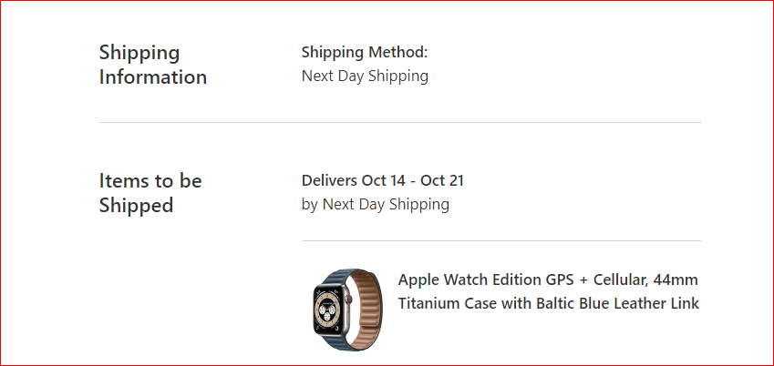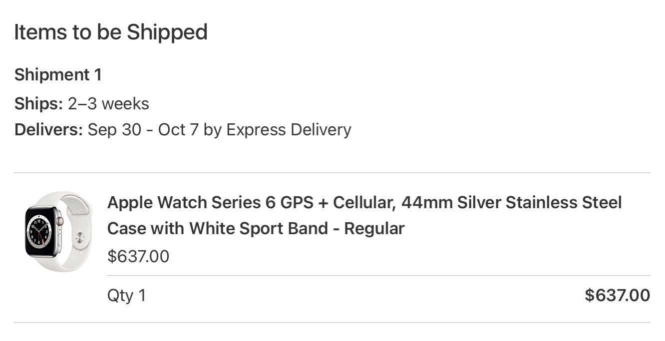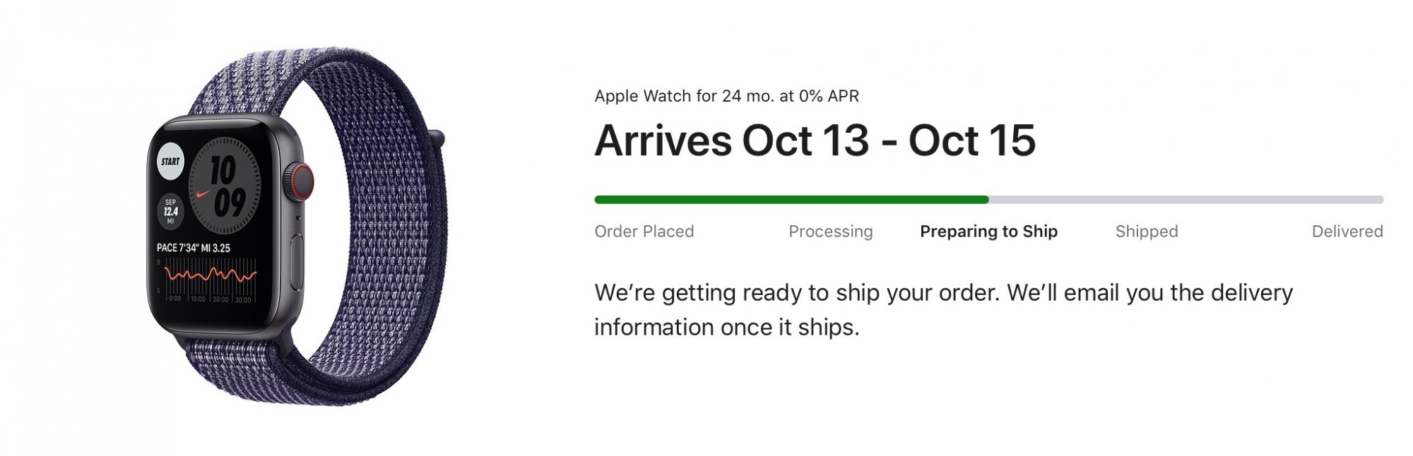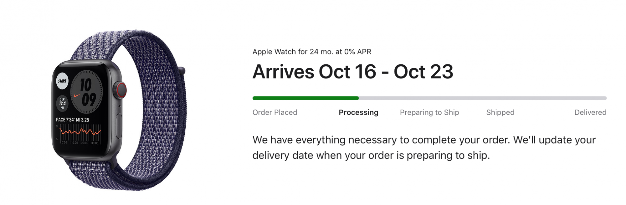 Nothing yet? You ordered same as me and have same dates as me.Actually had Sep 25-29, but the order got stuck submitting, so backed out and did it again. All good. Upgrading from Series 3 Stainless Steel GPS + Cellular.