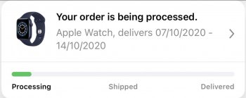 I expect you to get a tracking number tomorrow and get the watch about 8 days later- that lines up with my first order.Still nothing on these, still in processing, and I’m now within the delivery window for the bands. Can’t remember the last time (if ever) any of my orders hit the delivery window date while still showing no movement. Womp womp.