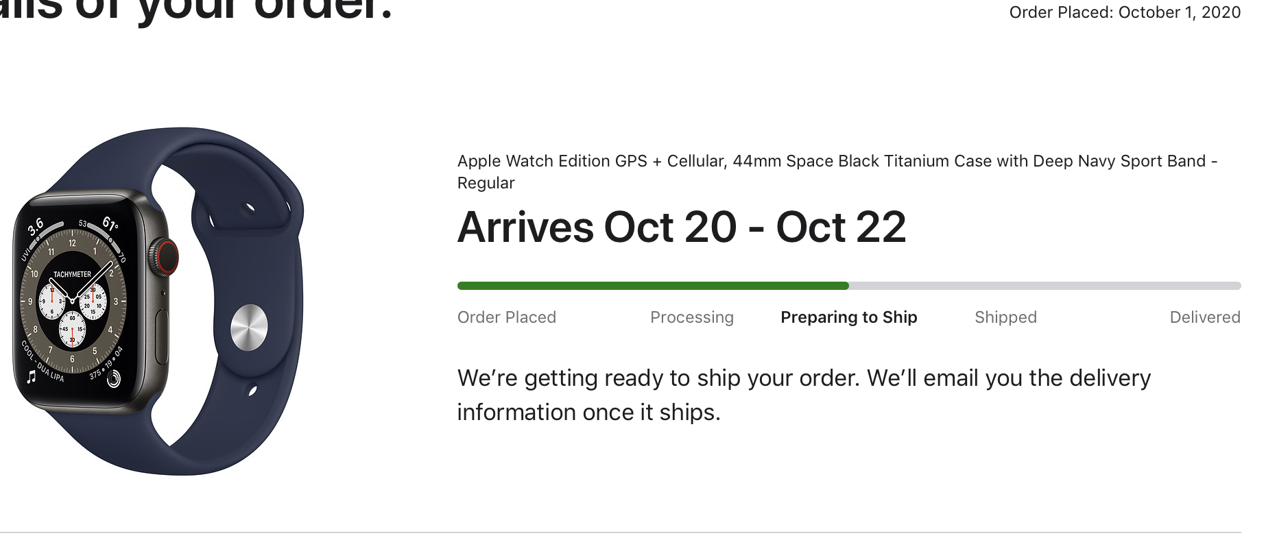 Ordered AW6 SBTi with Navy Blue sport bands on 10/1/2020 and now went to preparing for shipment. This is a gift for my dad but pretty interesting after 6 days this went to prep for shipping. View attachment 963526