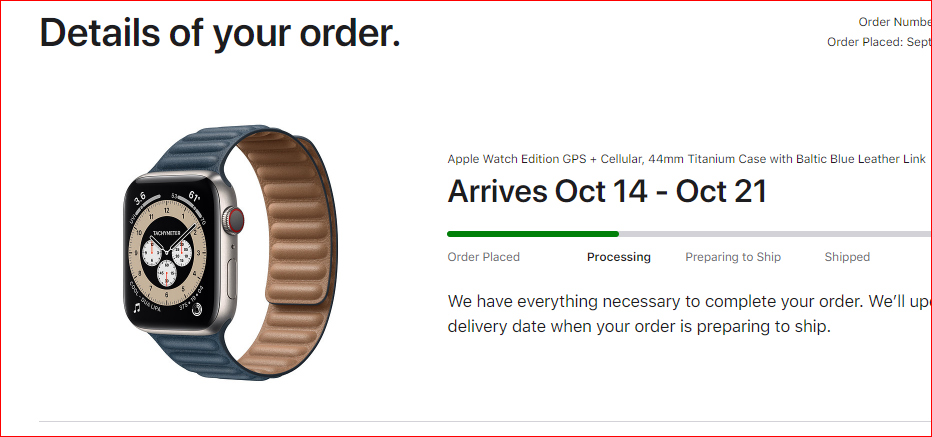I ordered the 18th and shipping date shows Oct 20-27Even though my watch delivery date has changed to come a week early 7th-14th October, going to be 7 days since I ordered the watch, hasn’t moved from processing order. 🥺 doubt I’ll get it around the 7th.