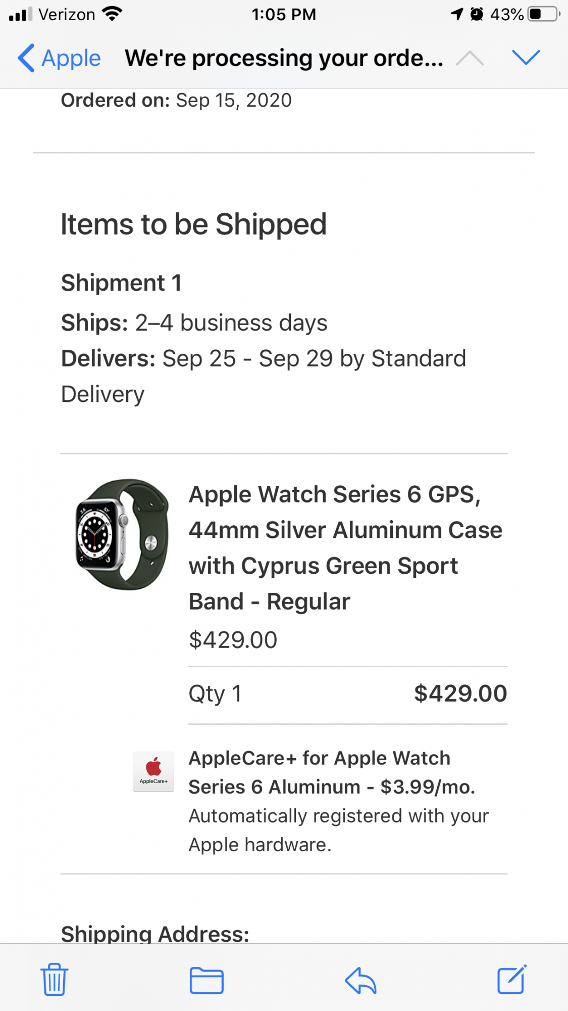 I ordered a space grey 44mm GPS with the (something) green sport loop (hope it isn't too sweaty!). A couple of hours in to order window. Sept. 25-29.