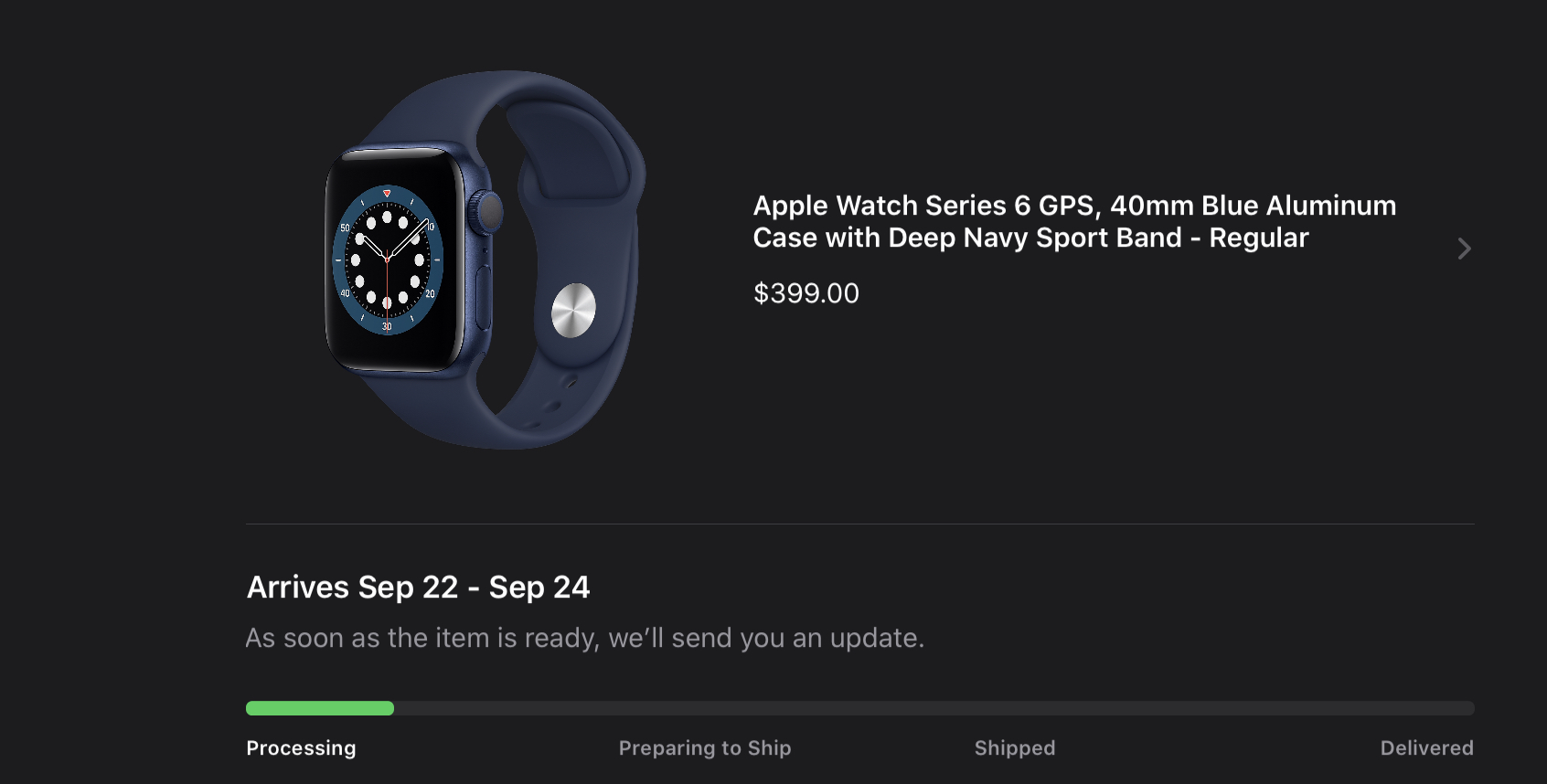 I would be willing to bet that one tracking number is for your watch and the other tracking number is for the extra bands that you ordered.For those who can confirm their watch has shipped, what does FedEx show for the dimensions of your package? I ordered a watch and two bands (3 items) and I now have two tracking numbers in the FedEx app. Both are showing dimensions of 14x1x4 and 1lb which leads me to believe each shipment is a band. Watch has estimated delivery of Sept 25-29 but shows “preparing to ship” just like the bands do but bands are confirmed for Friday.