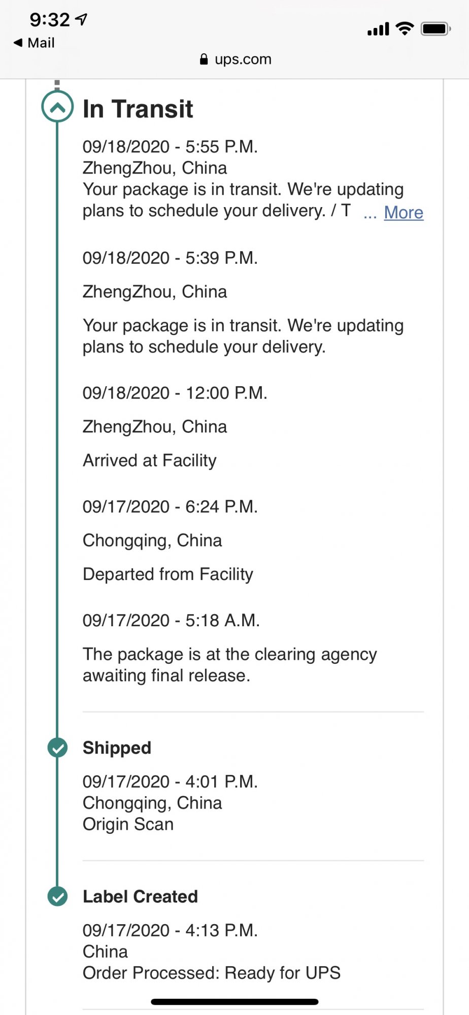 Anyone else stuck in ZhengZhou for several days now? UPS originally showed a delivery date of September 22, but has been showing “in transit” for a while.