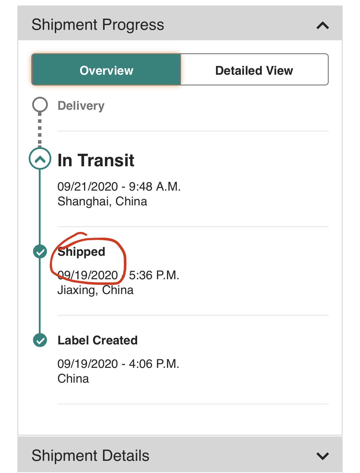 Apple won’t show shipped until the package enters the U.S.