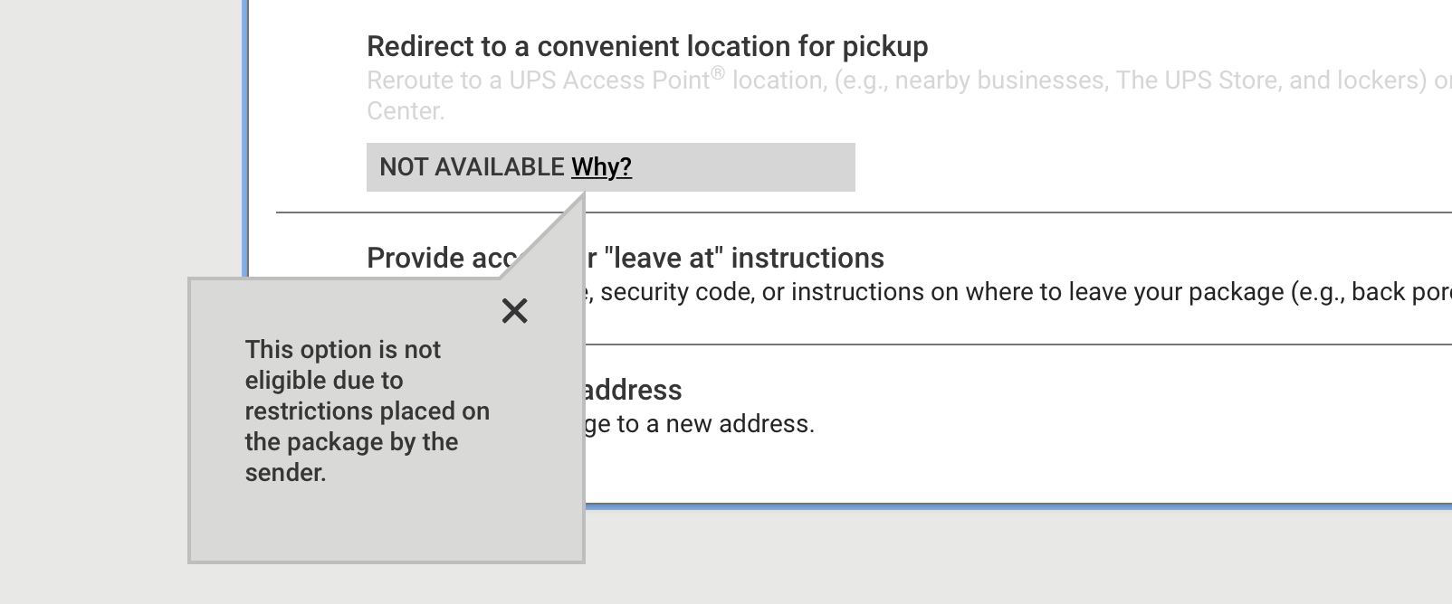 It's not going to give you the option. Call UPS and get a representative on the line. You can say "Agent" talk to a live person and ask if you can pick up the package tomorrow. Make sure you confirm the address. Good luck!Looks like its not giving me the option. It states that there is restrictions placed by the sender.