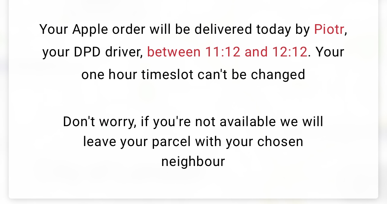 I’m getting nervous, was expecting a midnight aluminium today (UK), charged immediately, shipped yesterday, but the DPD tracking info never updated… I know they rotate tracking numbers, but at 7am on the day of delivery I’m still seeing this nonsense. 😳