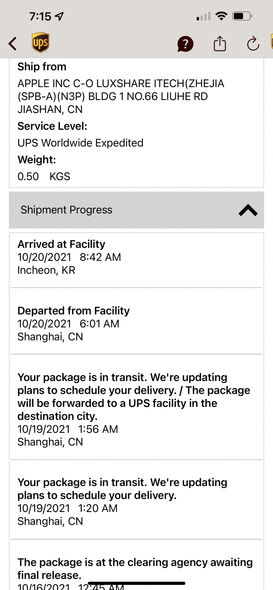 Well an update I (we?) left Shanghai two hours ago. Only flights close was a actual UPS flight that landed in Korea a short time ago but no scans to indicate that my guess is correct.Congratulations! Glad you got an update from UPS. Next time get yourself an express shipping![]()