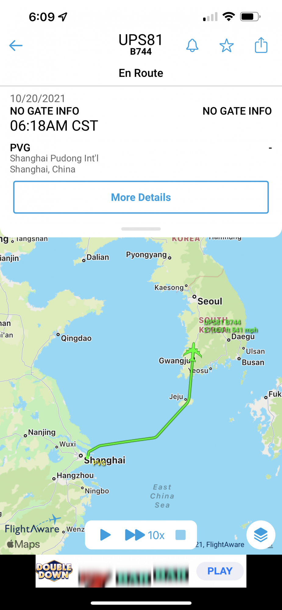 I used the Flightaware app. Looked at Shanghai to see what planes left after 6:01 am China time. I actually found two UPS flights and the one closest was UPS81 that arrived after hour and half in Incheon.