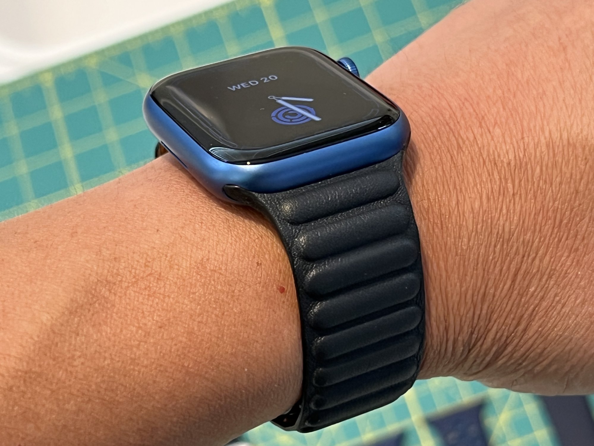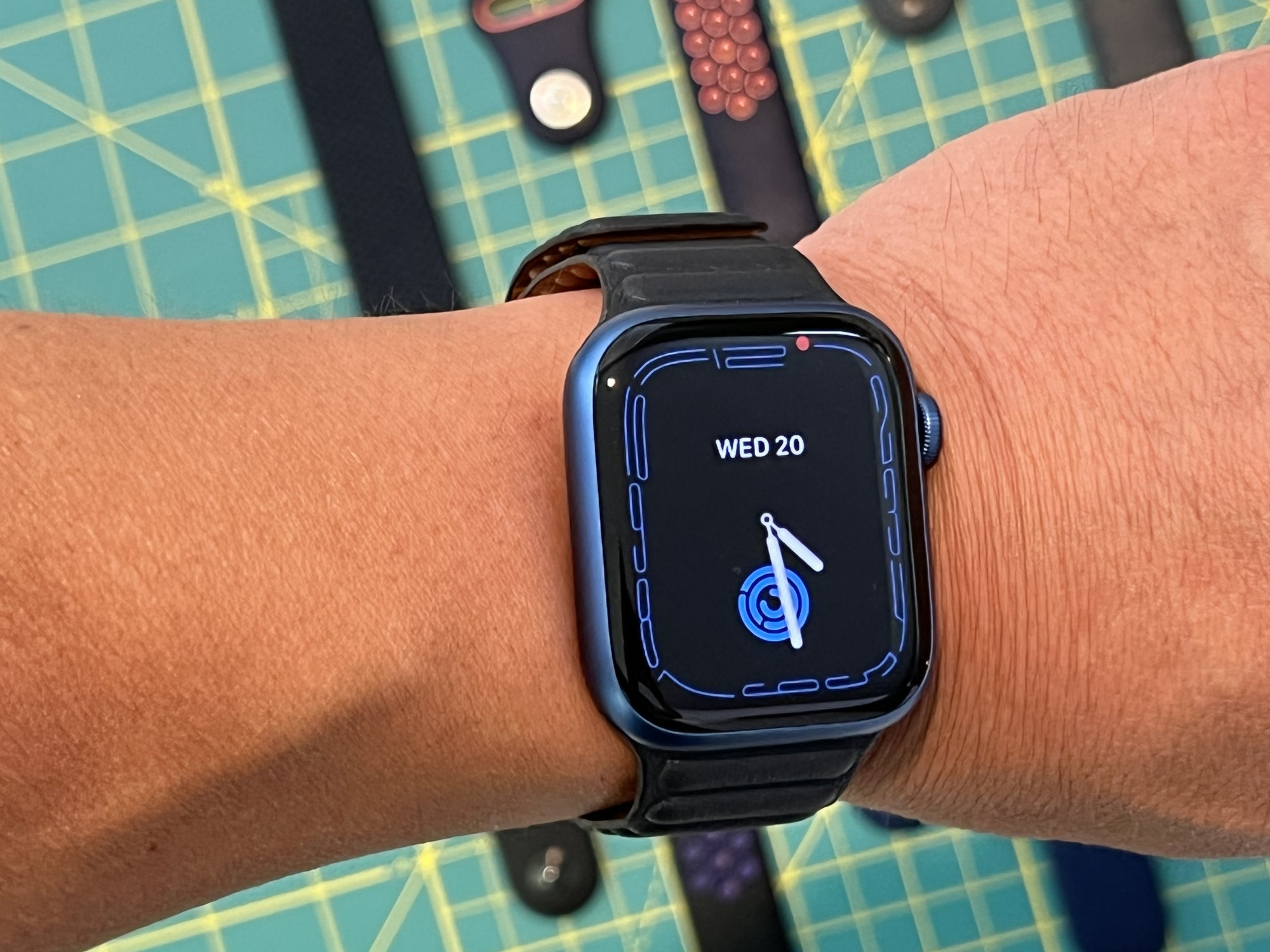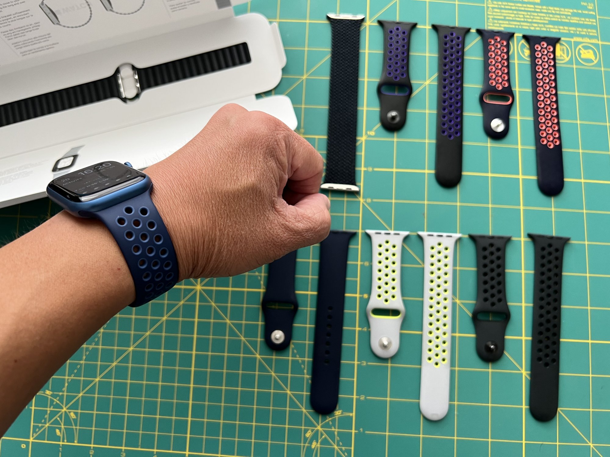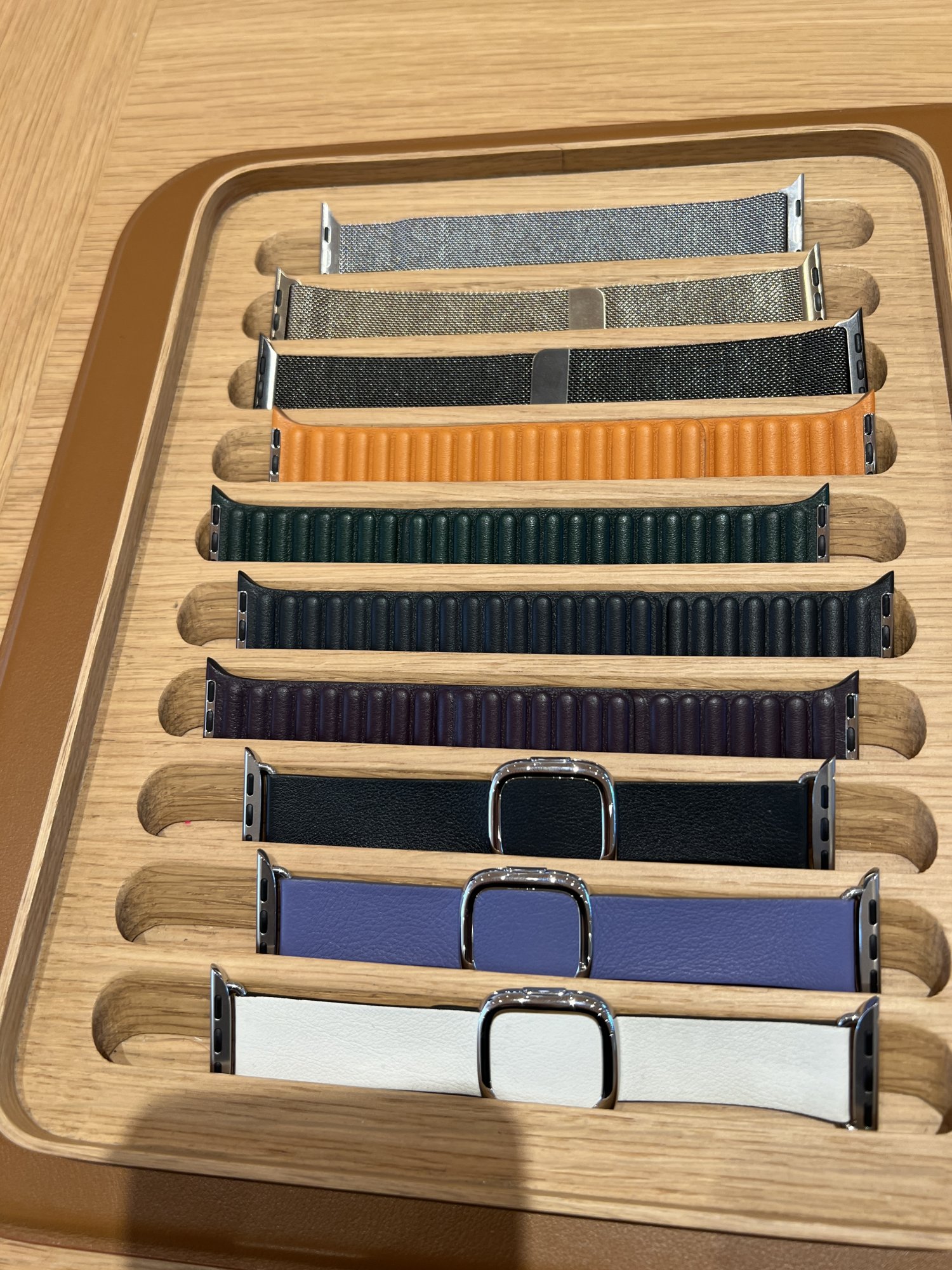 So within 20 hours of my order through apple with their free shipping, it delivered to my door. Here's my Midnight Leather with Blue Al, and some others of my small collection of bands. I usually only have one, maybe two bands per watch at a time, so I'm just in the minor leagues with this.