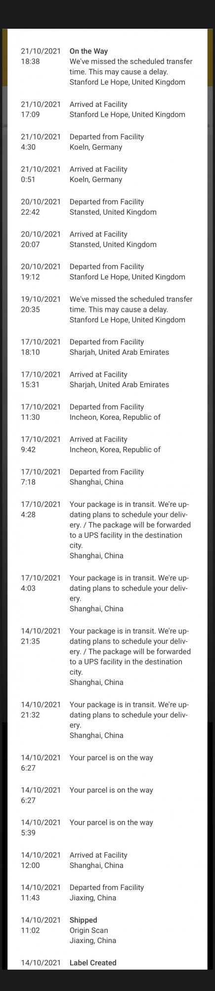 View attachment 1873827UPS royally screwing with me. Ordered Green AW7 GPS + Cell just after orders and got delivery on Apple estimated 19-21 Oct. Great. Dispatched from China on 14th Oct. Has been on some travels since, see UPS tracker. I’m actually in the UK though for some reason it’s been here, sent to Germany and back and now delayed again!! Arrrgghhhh