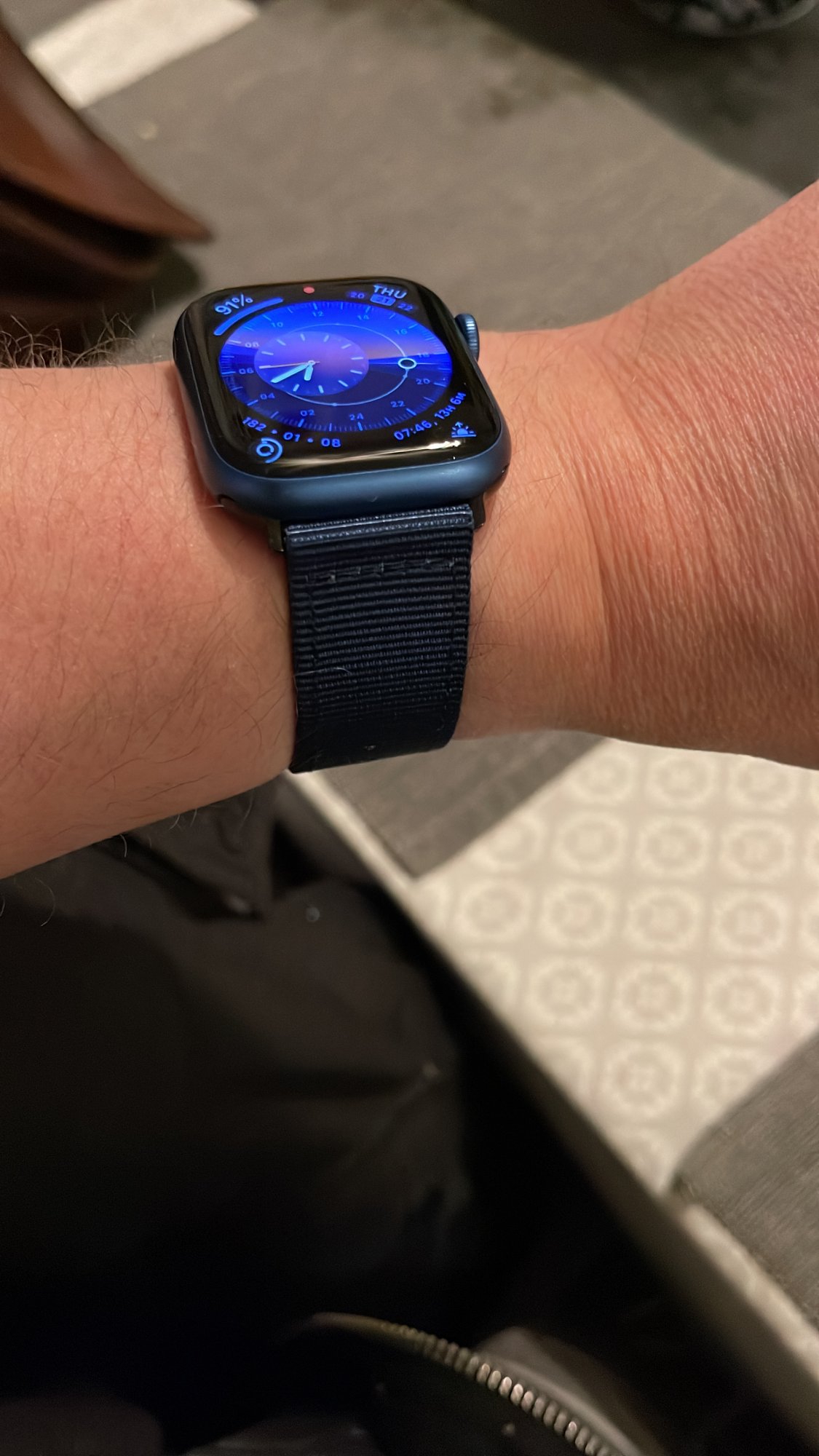FedEx came through a day earlier than expected, even though it 6 days later than it was originally supposed to be here! Aluminum Midnight 45, with black solo loop. Coming from a serious 2, WOW what an upgrade! First solo loop too. Used a tape measure to measure my wrist and it told me to order a size 11 based on measurement, and it fits great, if not a bit snug right now, but I see people say they do stretch a bit. Have had it for about 2 hours now and can’t stop playing with it! So many new things to do with it!