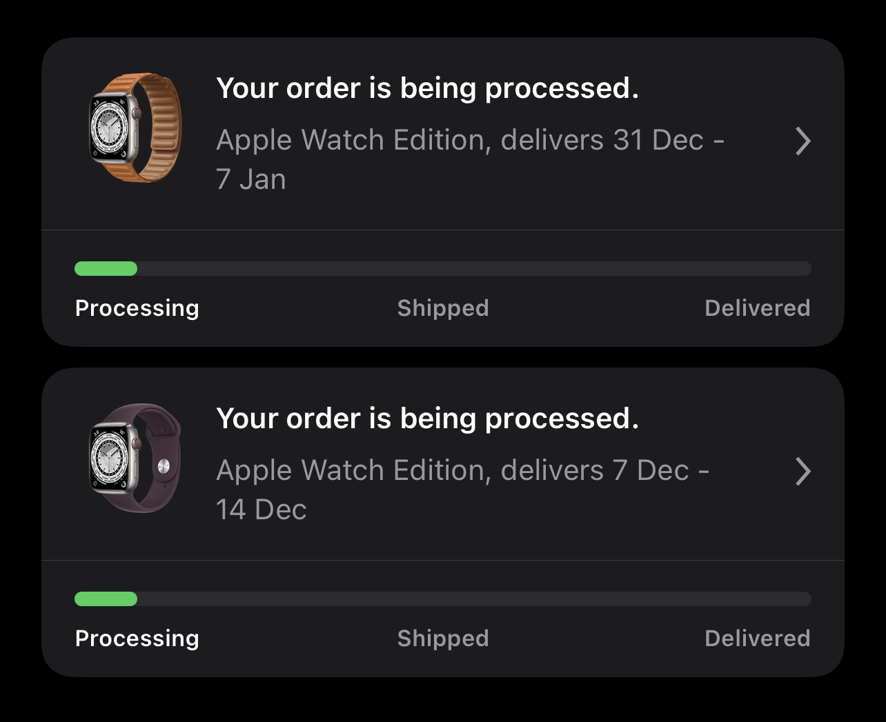Woohoo. Just got charged for the Leather Link one’s amount which was supposed to ship much later (it’s the one I wanted to keep in the end). 🙌 The Apple Store app still shows processing for both for now.I’m still impatiently waiting for one of these to see some sort of change…the top one was ordered Nov 21 and the bottom one was ordered Nov 18.